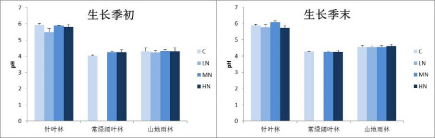 经过3~4年的施肥处理,氮添加提高了森林土壤矿质氮(铵态氮和硝态氮)含量。其中,寒温带针叶林土壤铵态氮对施肥的响应程度(即土壤氮含量沿施肥梯度的斜率)最高,热带森林最不敏感,随着纬度的升高,土壤铵态氮含量对施肥的响应程度逐渐提高。土壤硝态氮在亚热带常绿阔叶林与寒温带针叶林中响应较为敏感,在其他森林响应不敏感,其响应沿纬度并未呈现一定规律(图10)。研究还发现,3~4年氮添加处理对土壤pH(0-10cm)没有产生显著影响,因而未出现明显的土壤酸化现象(图11)。