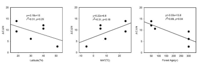 图14.森林净初级生产力的施肥效应(kg C/kg N)随纬度、年均温及林龄的变化