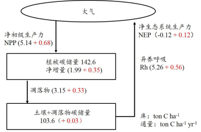 图16.中国典型森林生态系统碳循环模式对施肥的响应,括号内为通量值,红色表示正响应。