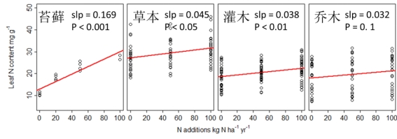 图12.苔藓、草本、灌木、以及乔木叶片氮含量对氮添加的响应