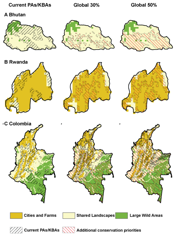 图5全球情景、30%和50%保护目标下,保护优先区在不同分区的分布。不丹的保护优先区主要位于C2(共享景观);卢旺达的保护优先区主要位于C1(城市和农田);哥伦比亚的保护优先区分布在C1至C3(大面积荒野)。这些例子突出了在全球情景和各国可能面临的不同情况下,为实现保护目标而平衡保护和社会经济发展的挑战。