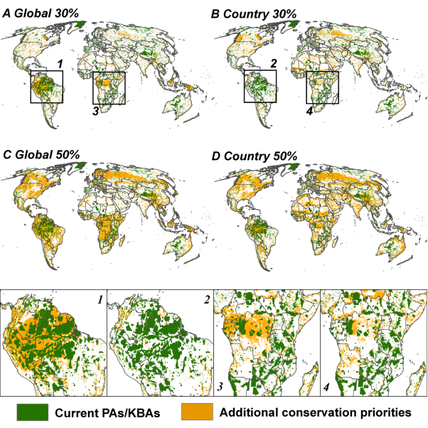 图1. 全球和国家情景、30%和50%保护目标下的现有保护地(PAs)、生物多样性关键区(KBAs)和有待增加的保护优先区。