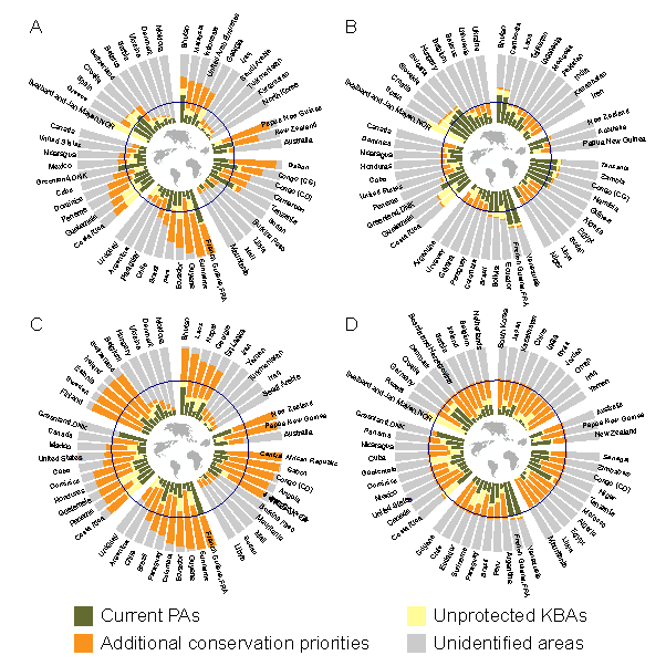图2. 全球和国家情景、30%和50%保护目标下的现有保护地(PAs)、未被保护的生物多样性关键区(KBAs)、有待增加的保护优先区和无需保护的地区的面积百分比。此图只显示了各大陆上土地面积>30,000平方千米、目标百分比最高和最低的5个国家。少数国家在国家情景下的保护目标超过30%(B)或50%(D),以满足其他要求(如生态系统代表性)。