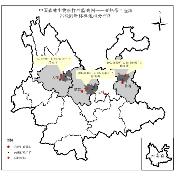 E.监测对象:半湿润常绿阔叶林—元江栲(Castanopsis orthacantha)群落,高山栲(Castanopsis delavayi)群落,黄毛青冈(Cyclobalanopsis delavayi)群落,光叶石栎(Lithocarpus mairei)群落