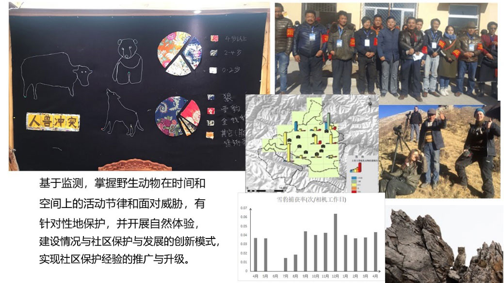 社区保护模式探索方面:与三江源国家公园合作,培训公益管护员开展日常的巡护、监测等工作,建立以当地牧民为主体的生态监测模式和数据库;针对人兽冲突,建立乡级冲突保险基金,实现更有效的冲突赔付机制;在监测基础上开展自然体验试点,建立保护与发展双赢的示范。